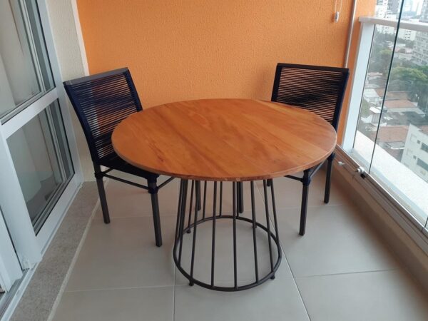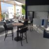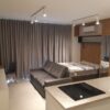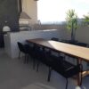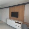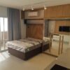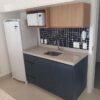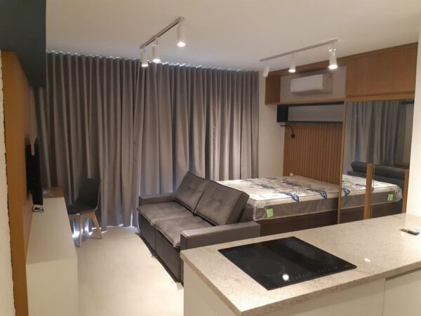 Ambiente sofisticado, com ar-condicionado, móveis planejados e decoração contemporânea. Cozinha americana equipada com cooktop, geladeira e micro-ondas, além de TV e móveis de alto padrão na sala e quarto.