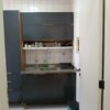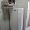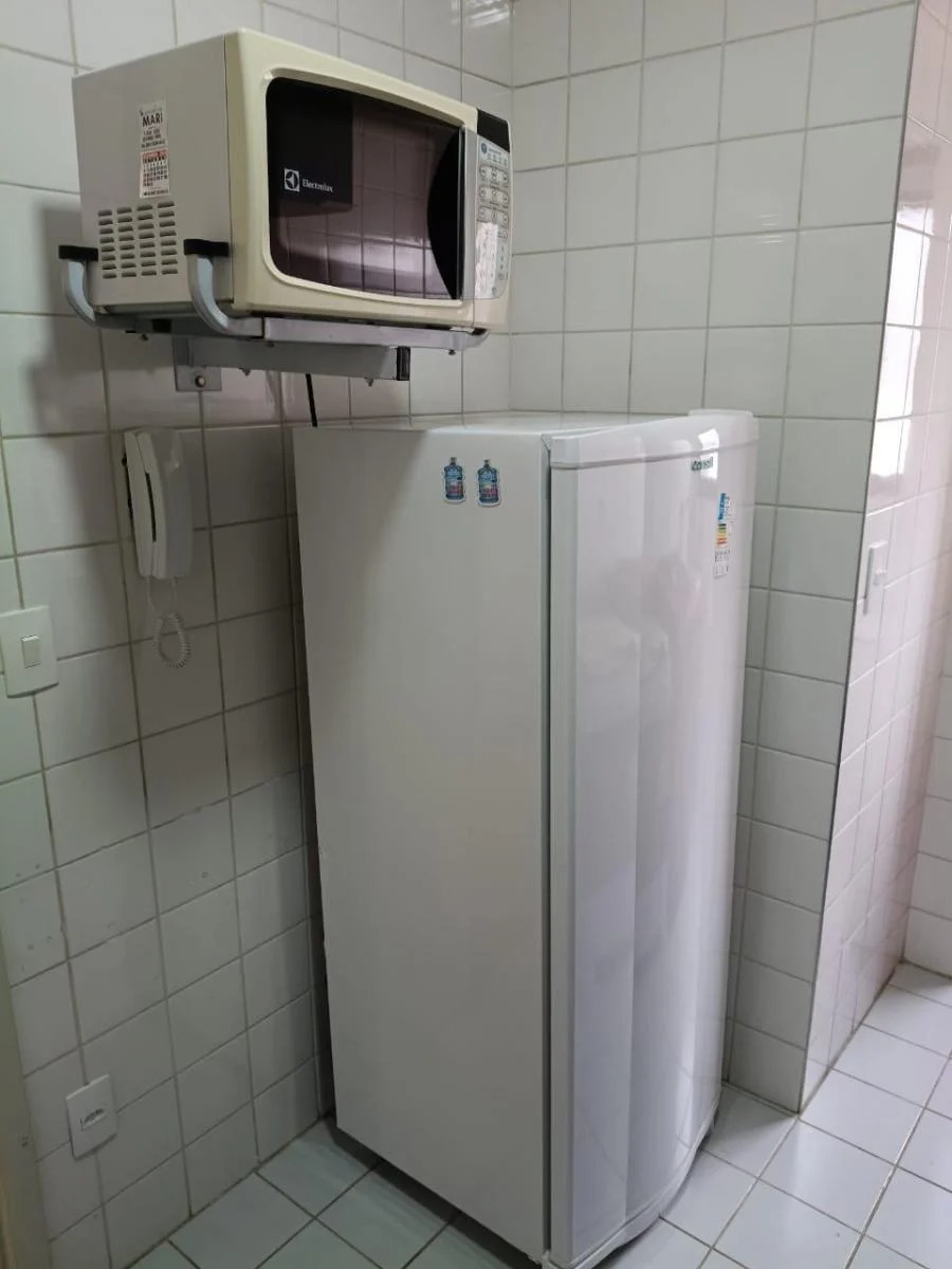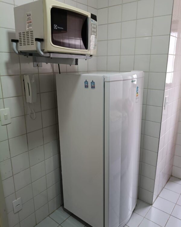 Cozinha com geladeira, micro-ondas e máquina de lavar roupa