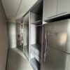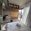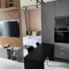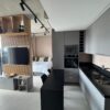 Sala de estar integrada à cozinha, já equipada com sofá, eletrodomésticos e ar-condicionado