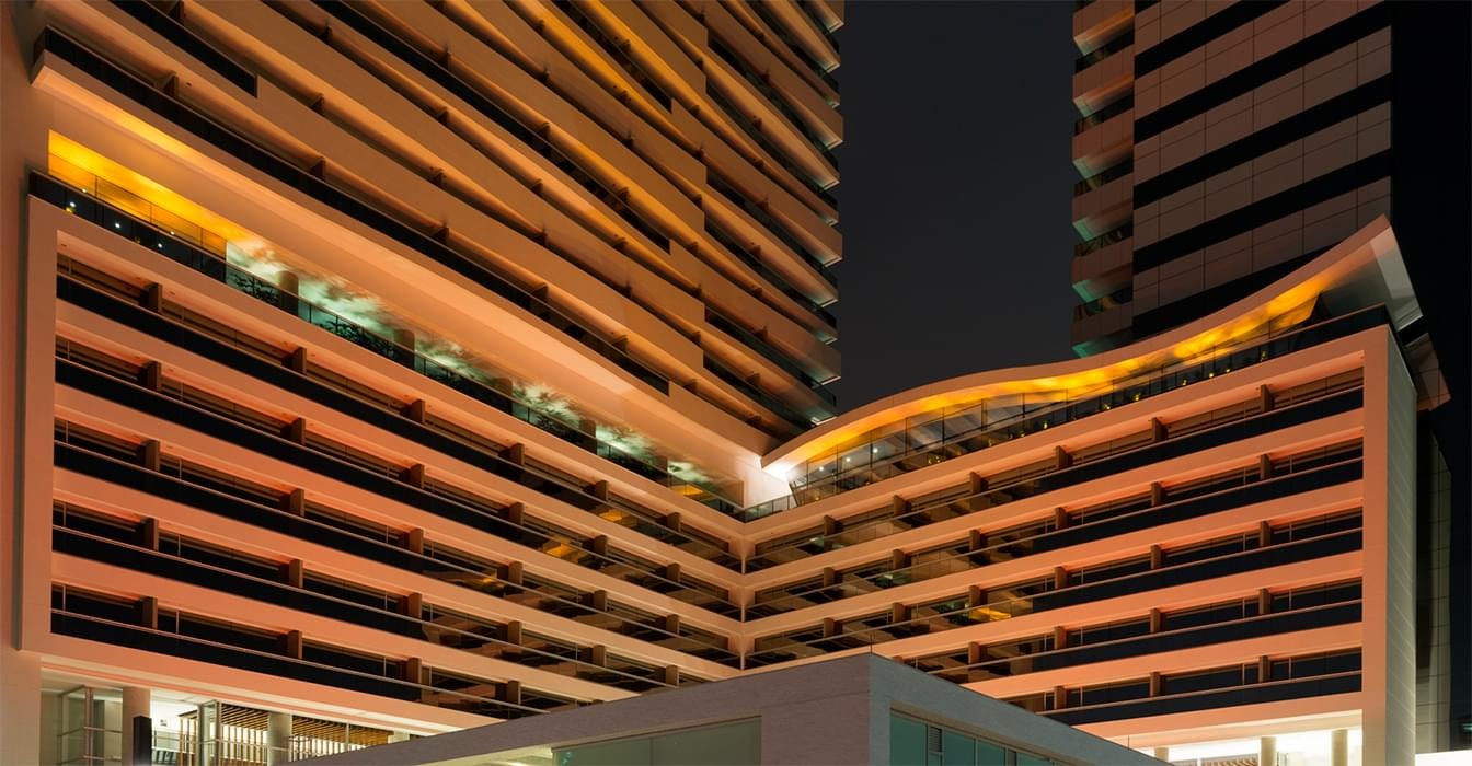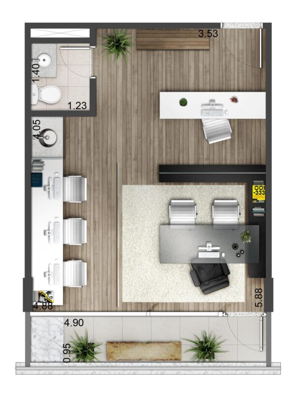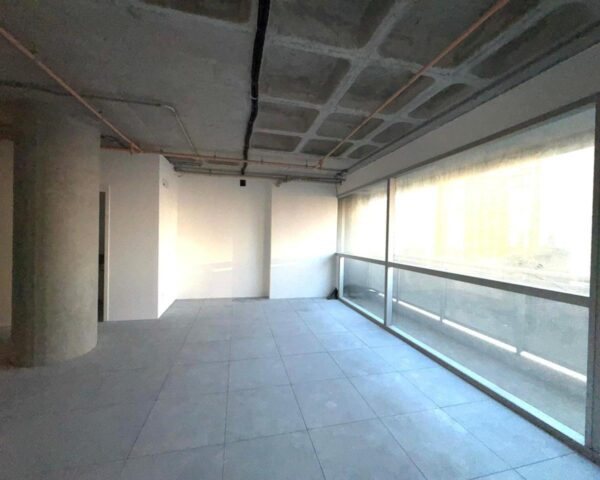 Faz parte de um complexo mixed-use, que inclui torre residencial, área comercial (offices) e um mall com 7 lojas. Suas lajes possuem até 1.195 m², que podem ser divididas em conjuntos menores, como esta sala de 89 m².